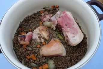 - Égouttez les lentilles et faites-les cuire dans un mélange composé pour moitié d’eau et pour moitié du fond de cuisson des jambonneaux, jusqu’à ce qu’elles soient tendres.