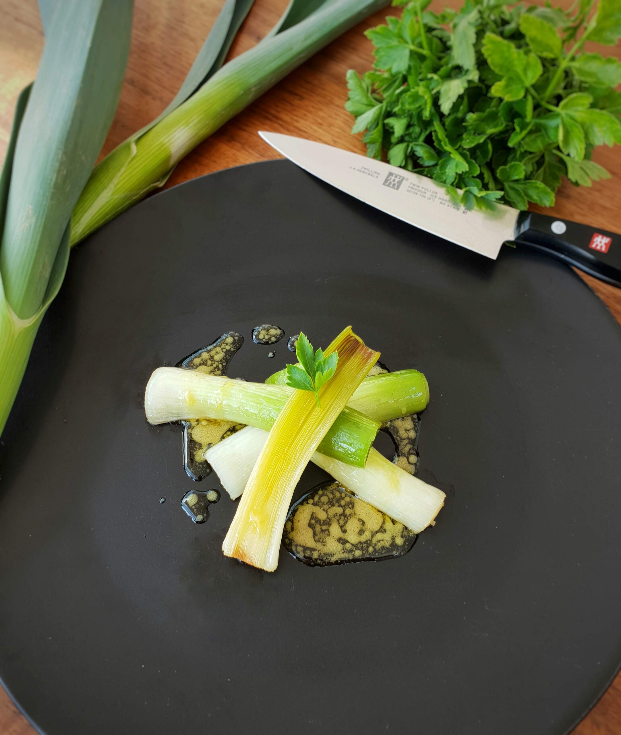 - Dressage : Dans l’assiette, disposez un cannelloni de poireau farci, un cœur de poireau nappé de mayonnaise, et un beignet de bulot surmonté d’une pointe de mayo. Parsemez de friture de poireau et de fleurs d’ail des ours.